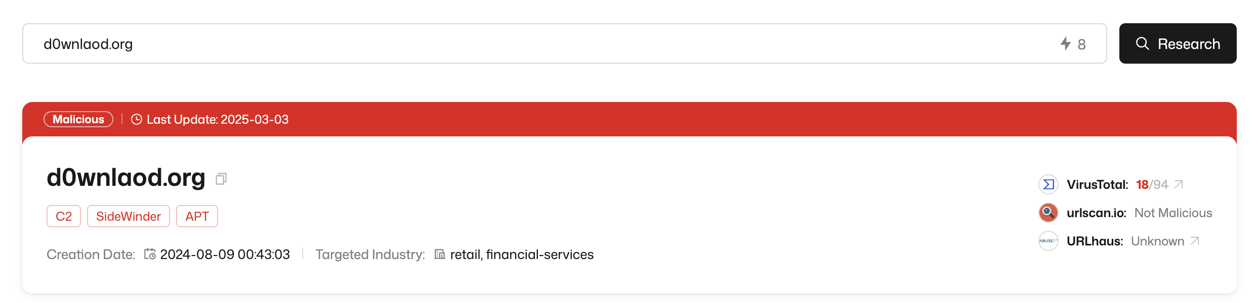 Each IP or domain comes with automated intelligence labels that categorize its risk profile.Including but not limited to the following categories:- Threat Attribution: Identifies links to APT groups, botnets, or malware campaigns.